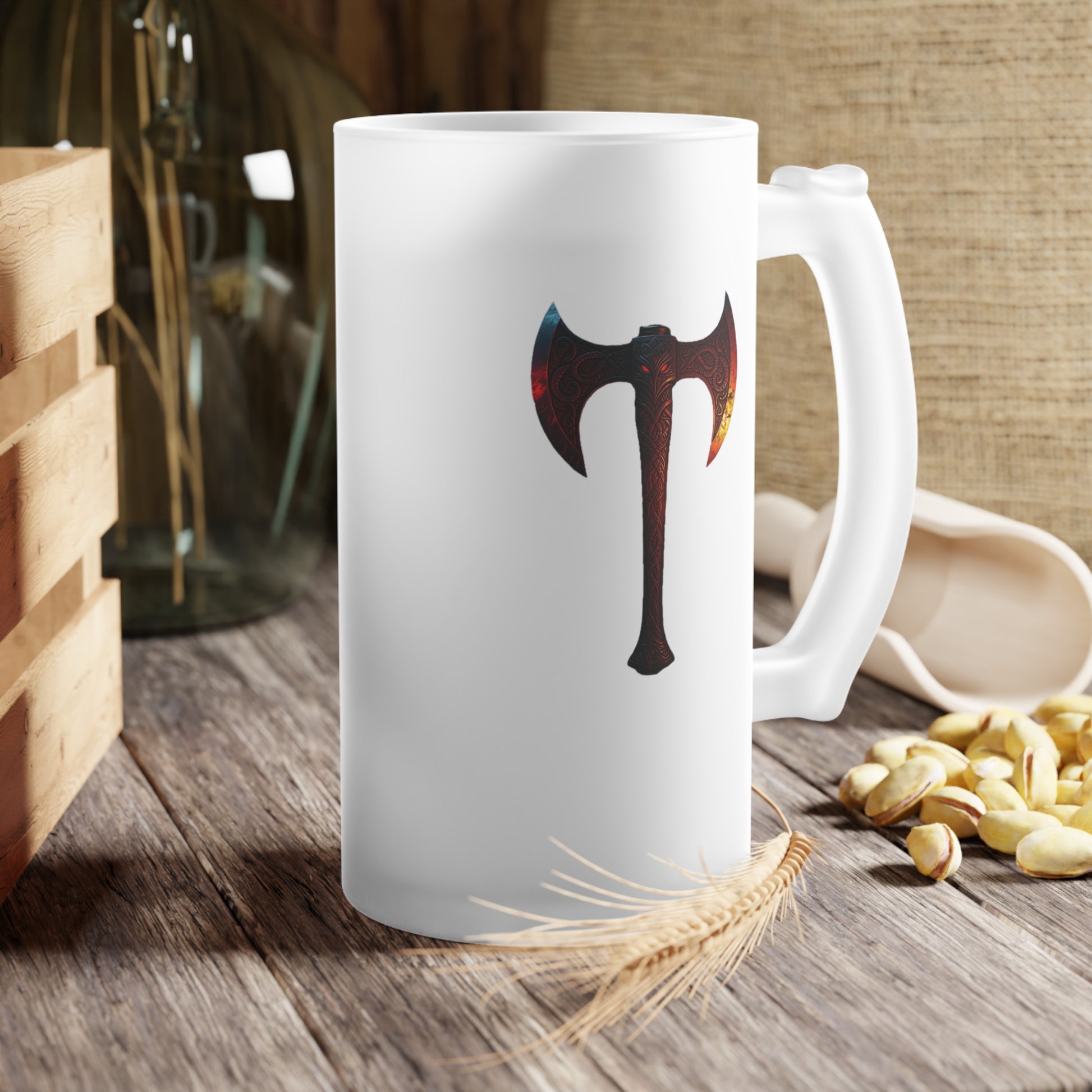 This Viking-themed frosted glass beer mug features intricate designs of battle axes. Perfect for those who appreciate Norse mythology and epic tales of battle. Ideal for beer enthusiasts and fans of historical warrior cultures. Great for gifting during Oktoberfest, Viking-themed parties, and Renaissance fairs.